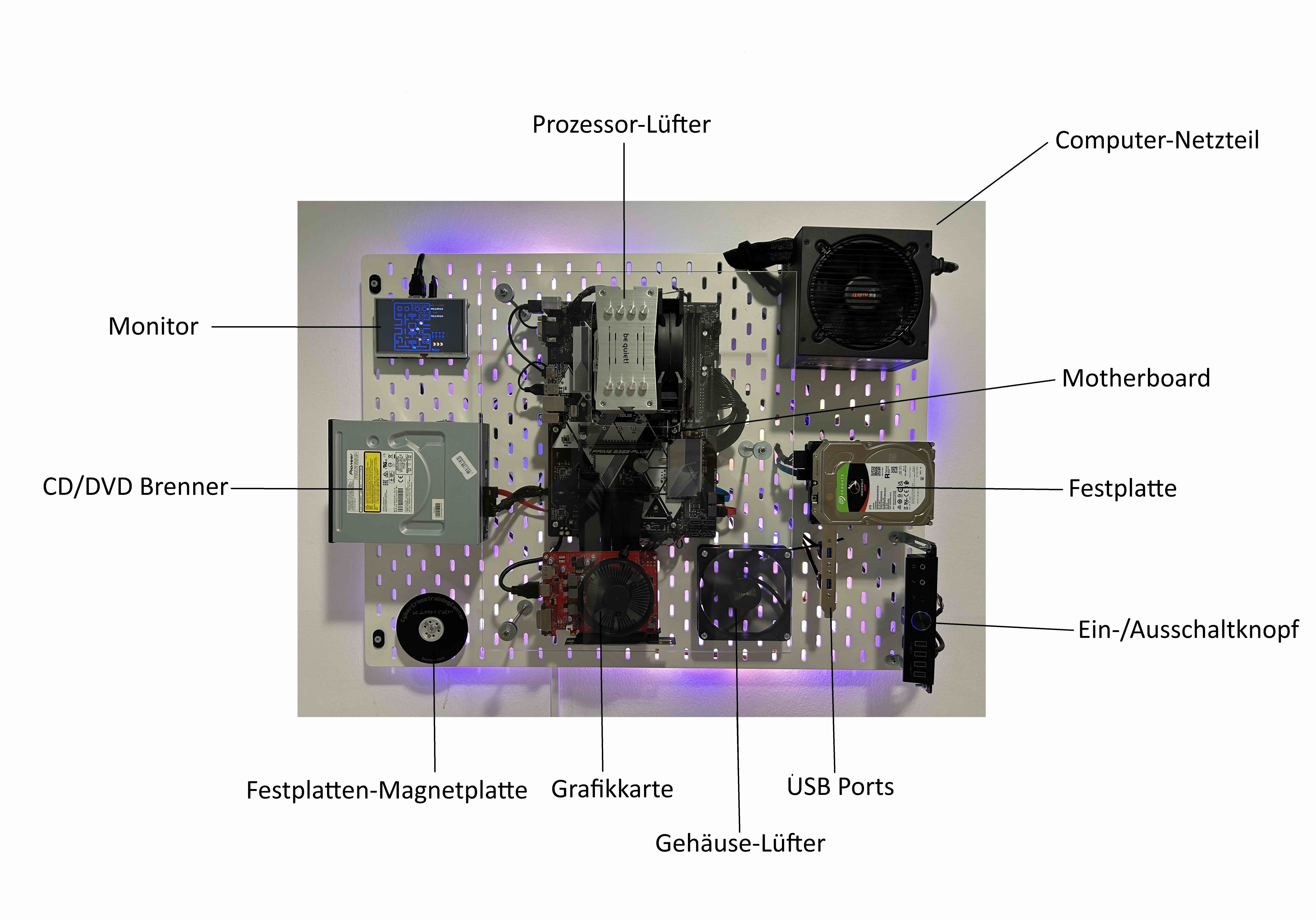 Ein ehemals genutzter Auswerte-PC für digitale Forensik wurde vollständig auseinandergebaut und auf einer Lochplatte montiert. Dadurch sind alle zentralen Komponenten – CPU, Mainboard, Netzteil, Speicher und Grafikkarte – frei sichtbar und nachvollziehbar angeordnet.